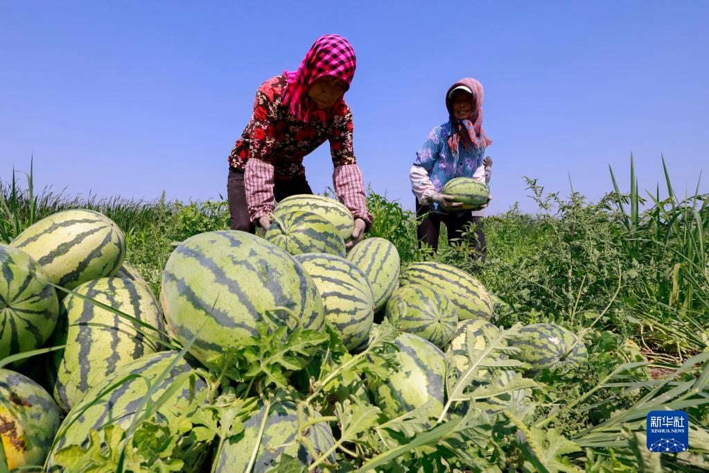 7月1日,河北省唐山市豐南區東田莊鄉亞莊子村農民在搬運采收的西瓜。
