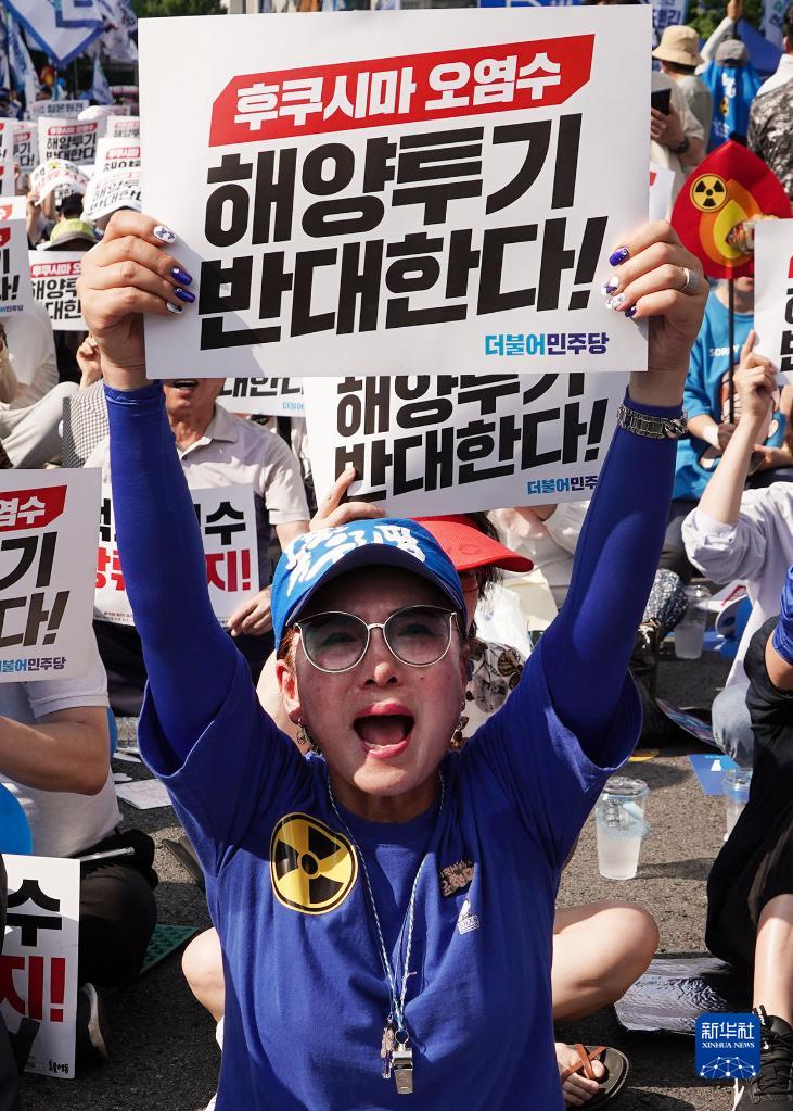7月1日,民眾手持“反對向海洋排放福島核污染水”字樣的標語(yǔ)在韓國首爾參加集會(huì )。新華社發(fā)(李相浩攝)