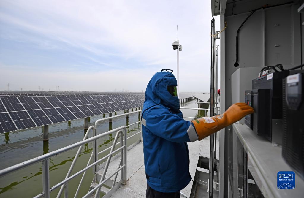 7月1日,在龍源天津海晶鹽光互補項目現場(chǎng),國家能源集團龍源電力天津公司工作人員在進(jìn)行箱變低壓側送電作業(yè)。