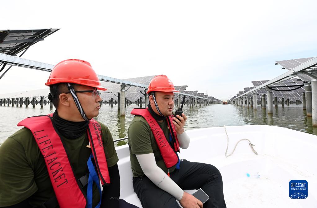 7月1日,國家能源集團龍源電力天津公司工作人員乘船在項目?jì)妊惨暋?/p>