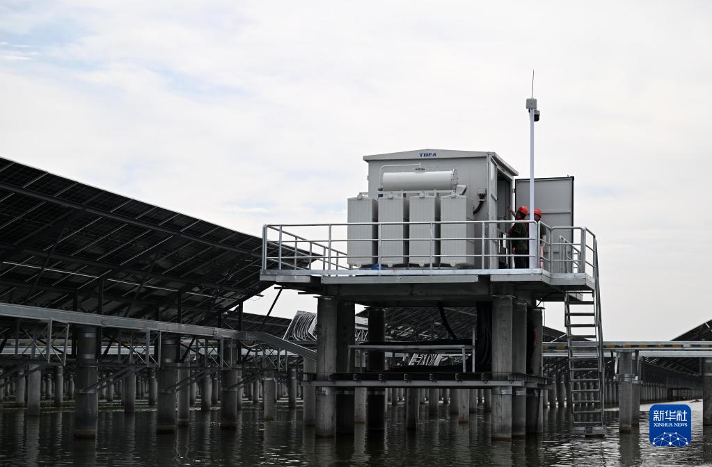 7月1日,在龍源天津海晶鹽光互補項目現場(chǎng),國家能源集團龍源電力天津公司工作人員在進(jìn)行箱變低壓側送電作業(yè)。