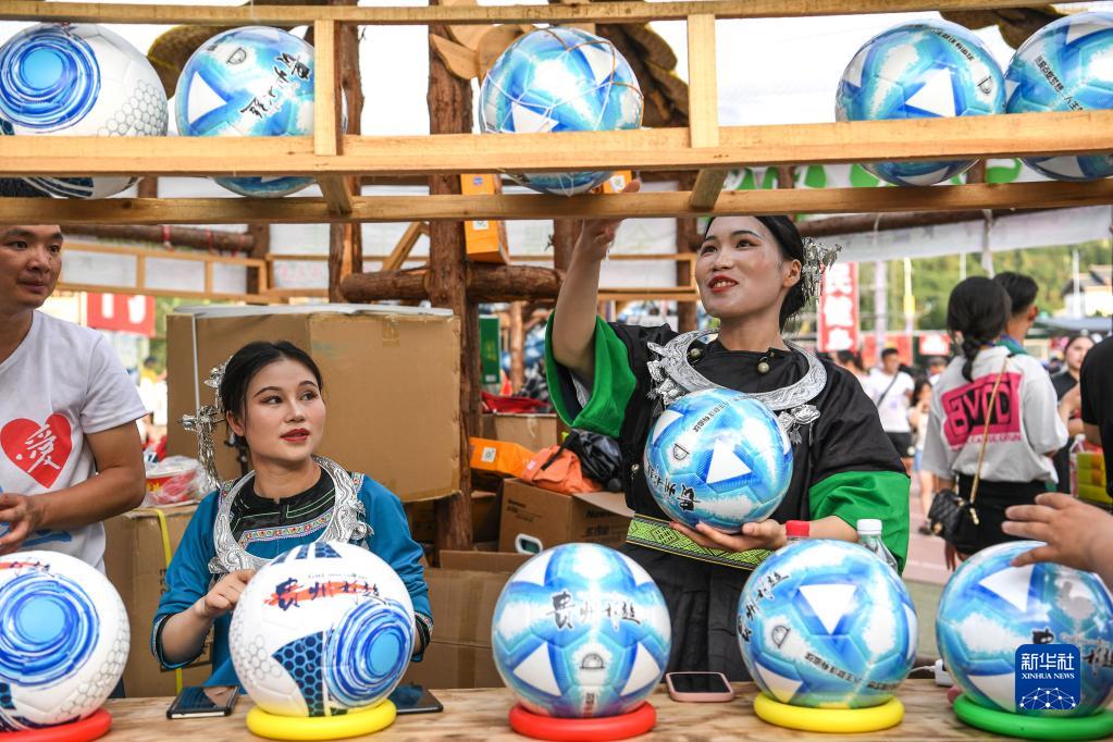 7月1日,村民在貴州“村超”足球賽場(chǎng)旁的文創(chuàng )攤位整理足球。