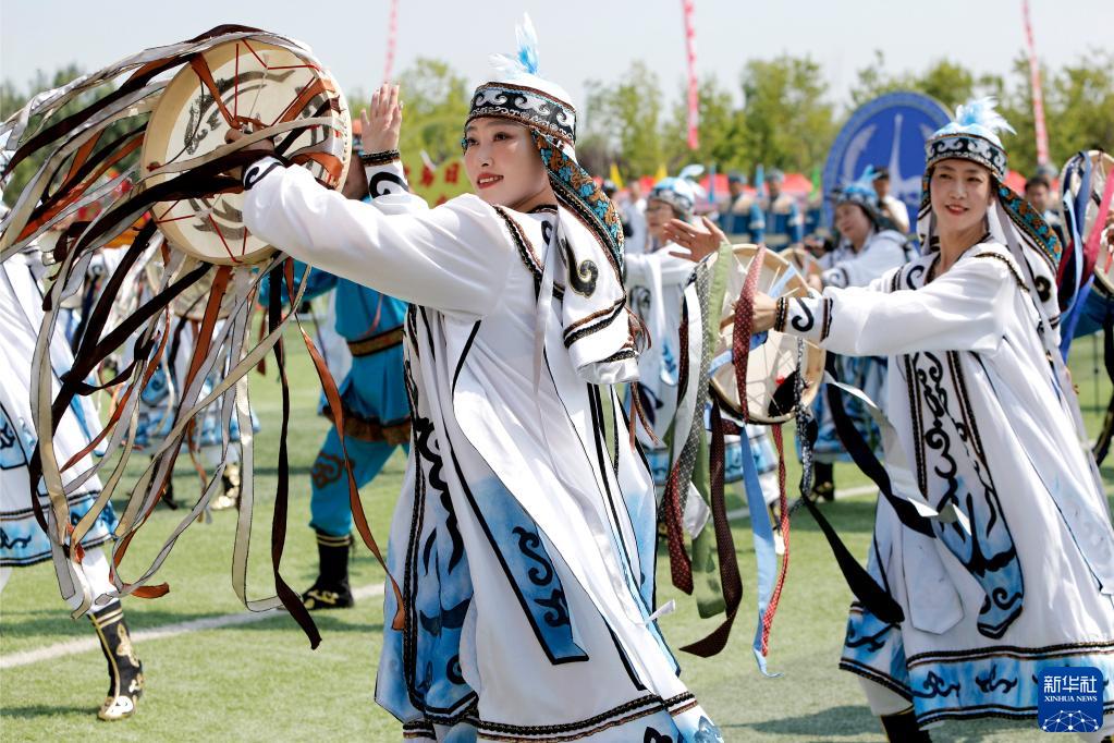 7月2日,在第十一屆赫哲族烏日貢大會(huì )現場(chǎng),赫哲族選手身著(zhù)傳統服飾進(jìn)行表演。