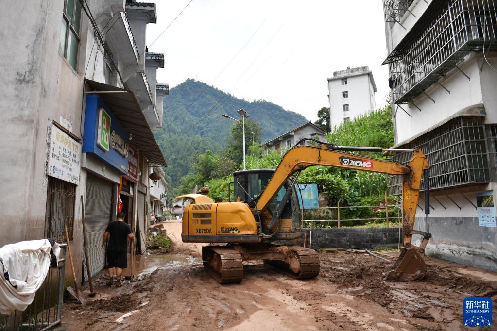 7月2日,在湖南省湘西土家族苗族自治州古丈縣巖頭寨鎮草潭村,村民駕駛挖掘機清理淤泥。