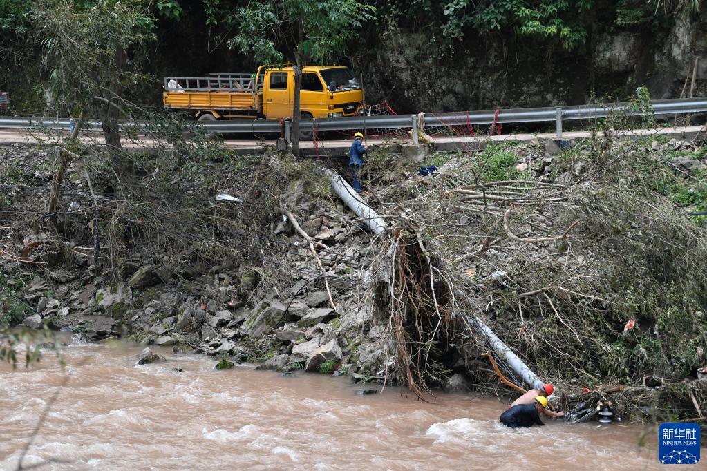 7月2日,工人在湖南省湘西土家族苗族自治州古丈縣巖頭寨鎮草潭村搶修電力設施。