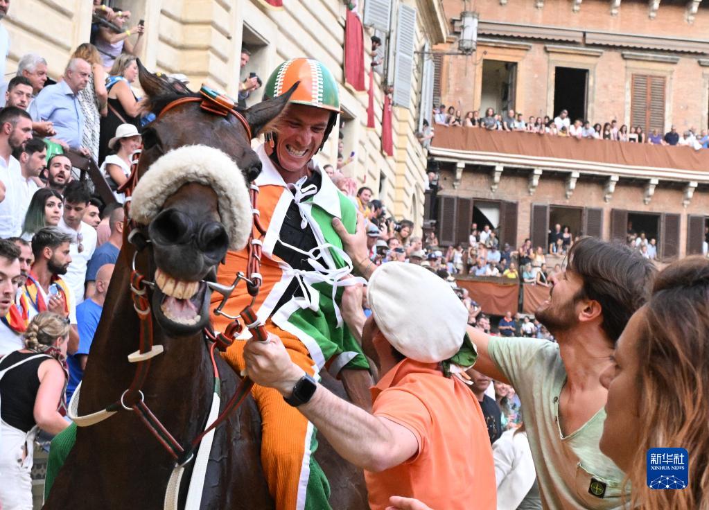 7月2日,獲勝騎手在意大利錫耶納慶祝勝利。