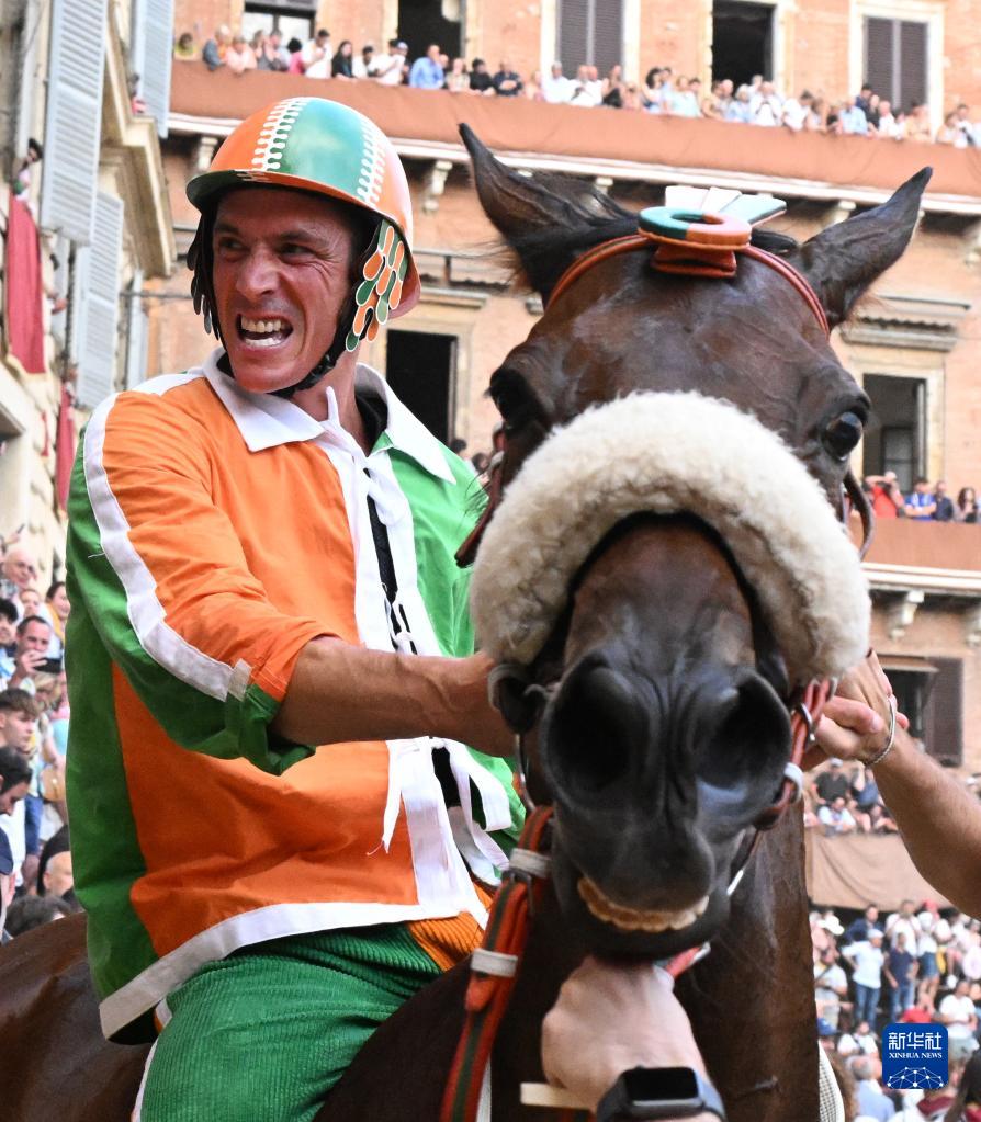 7月2日,獲勝騎手在意大利錫耶納慶祝勝利。