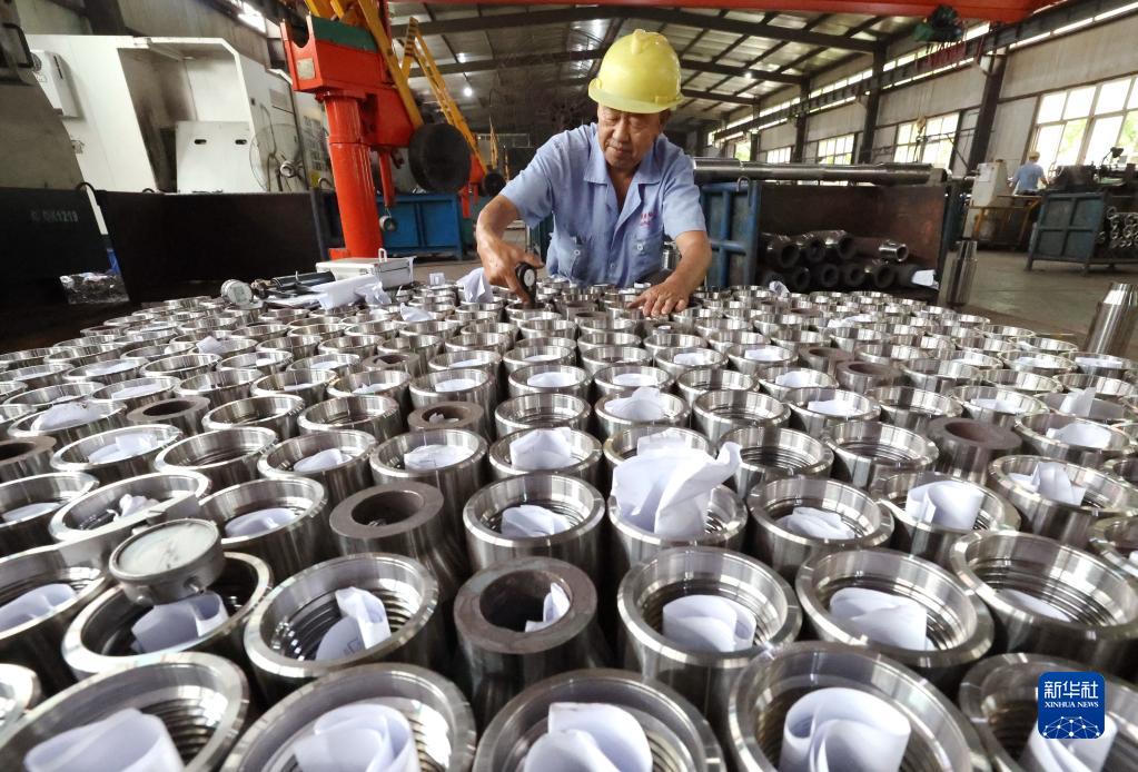7月3日,在河北省晉州市營(yíng)里鎮一家地質(zhì)裝備生產(chǎn)企業(yè),工人測量鉆頭螺紋尺寸。