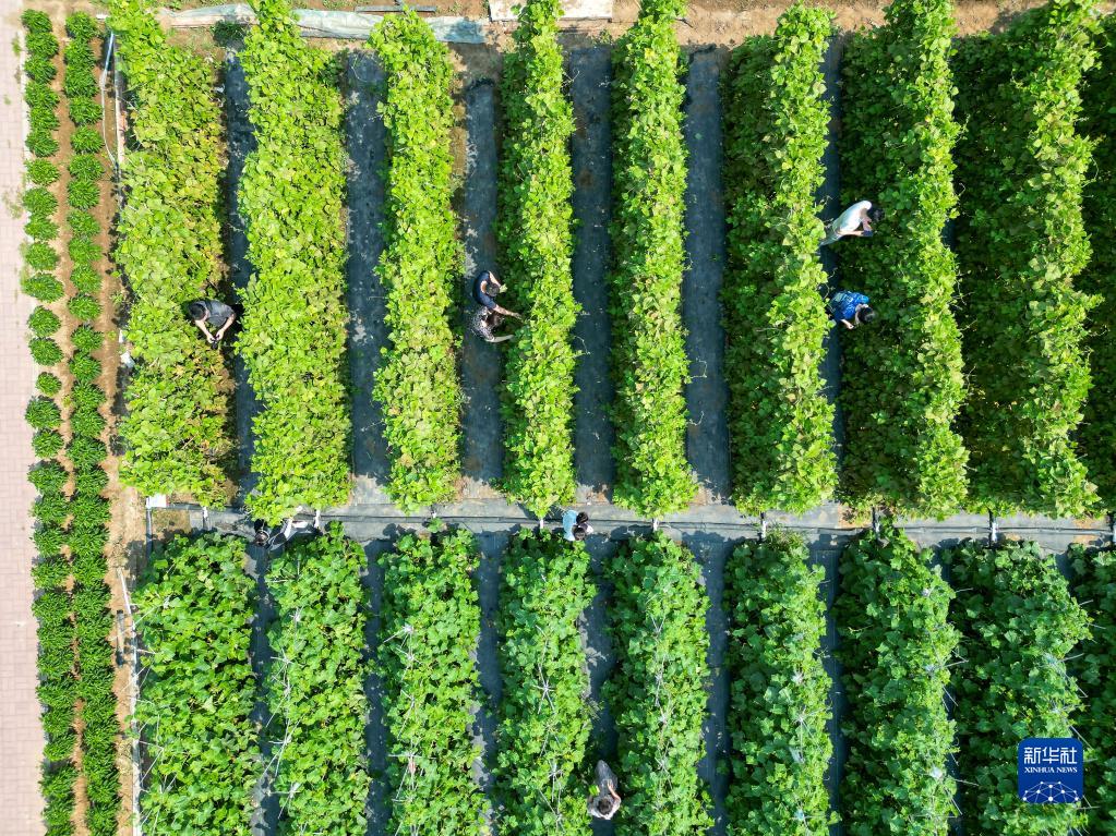 7月3日,市民在河北省唐山市路北區一處家庭農場(chǎng)內采摘(無(wú)人機照片)。