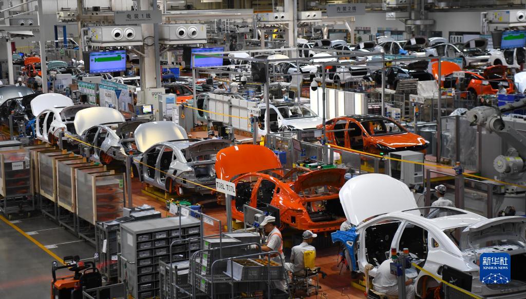 這是7月3日拍攝的廣州廣汽埃安第一智造中心新能源汽車(chē)總裝車(chē)間生產(chǎn)線(xiàn)。
