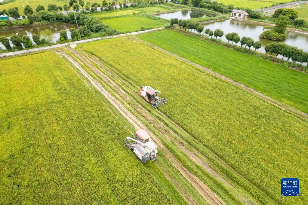 7月4日,在長(cháng)沙市望城區茶亭鎮蘇蓼村,收割機在收割早稻(無(wú)人機照片)。
