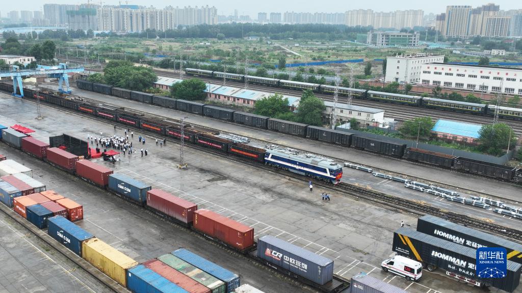 7月4日,首趟廊坊“中吉烏”國際多式聯(lián)運班列駛出廊坊北鐵路貨場(chǎng)(無(wú)人機照片)。