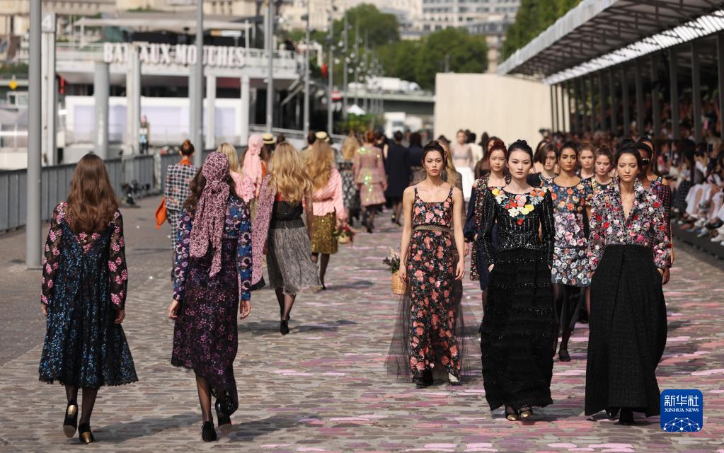 7月4日,在法國巴黎塞納河邊,模特展示法國品牌香奈兒2023/2024秋冬高級定制新品。