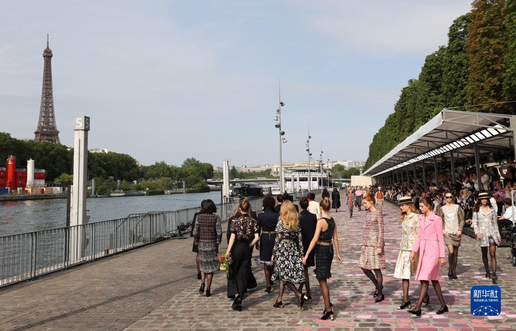 7月4日,在法國巴黎塞納河邊,模特展示法國品牌香奈兒2023/2024秋冬高級定制新品。