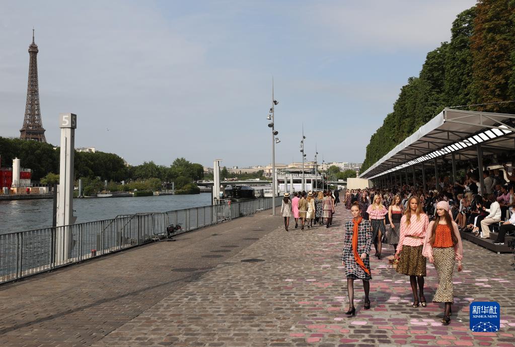 7月4日,在法國巴黎塞納河邊,模特展示法國品牌香奈兒2023/2024秋冬高級定制新品。