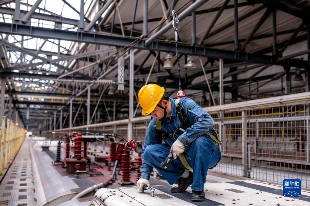 7月4日,動(dòng)車(chē)所地勤機械師在動(dòng)車(chē)組車(chē)頂對蓋板進(jìn)行扭力確認作業(yè)。