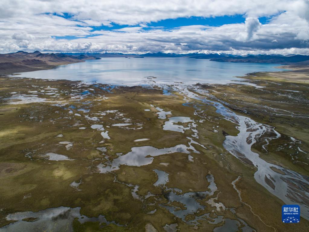 這是7月4日拍攝的普莫雍錯湖邊的濕地(無(wú)人機照片)。