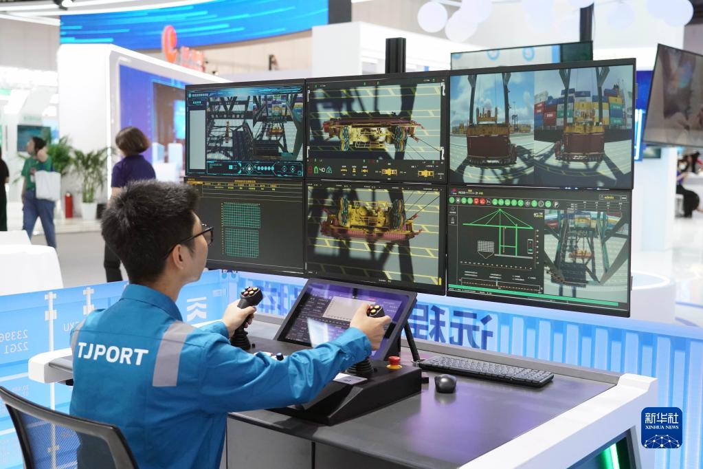 這是7月4日在2023全球數字經(jīng)濟大會(huì )精品主題展現場(chǎng)拍攝的自動(dòng)化岸橋遠程操控模擬系統。