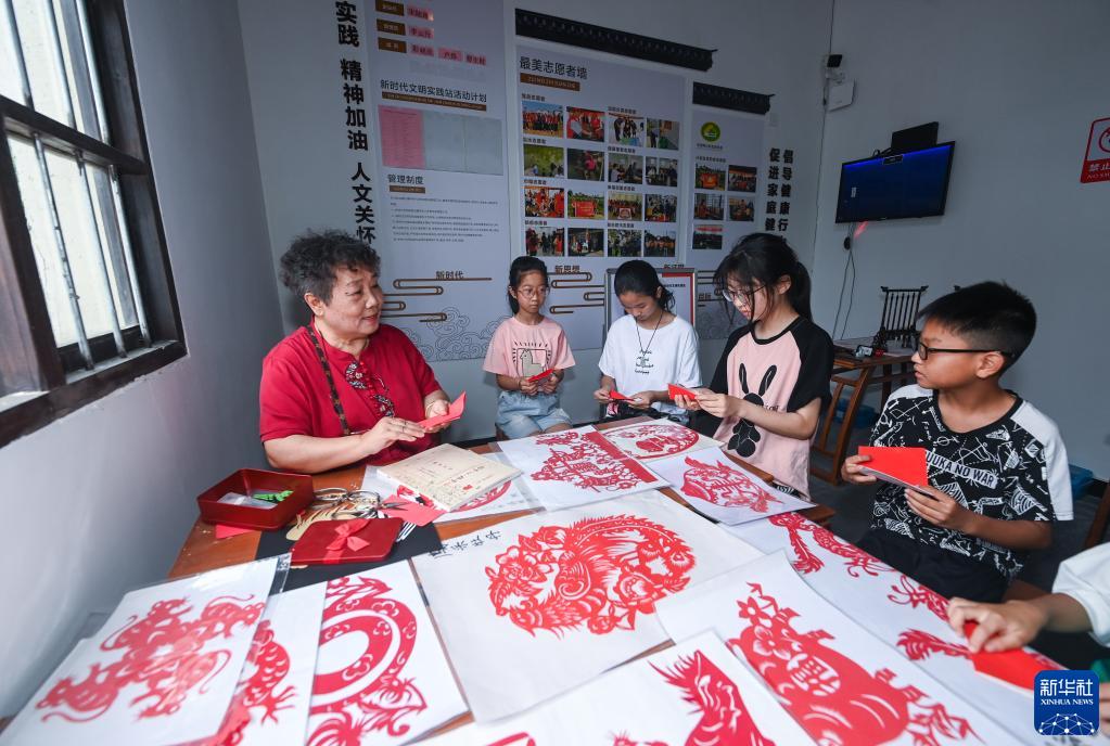 7月5日,剪紙老師在伍浦村文化禮堂內的暑期公益課堂教孩子們剪紙技藝。