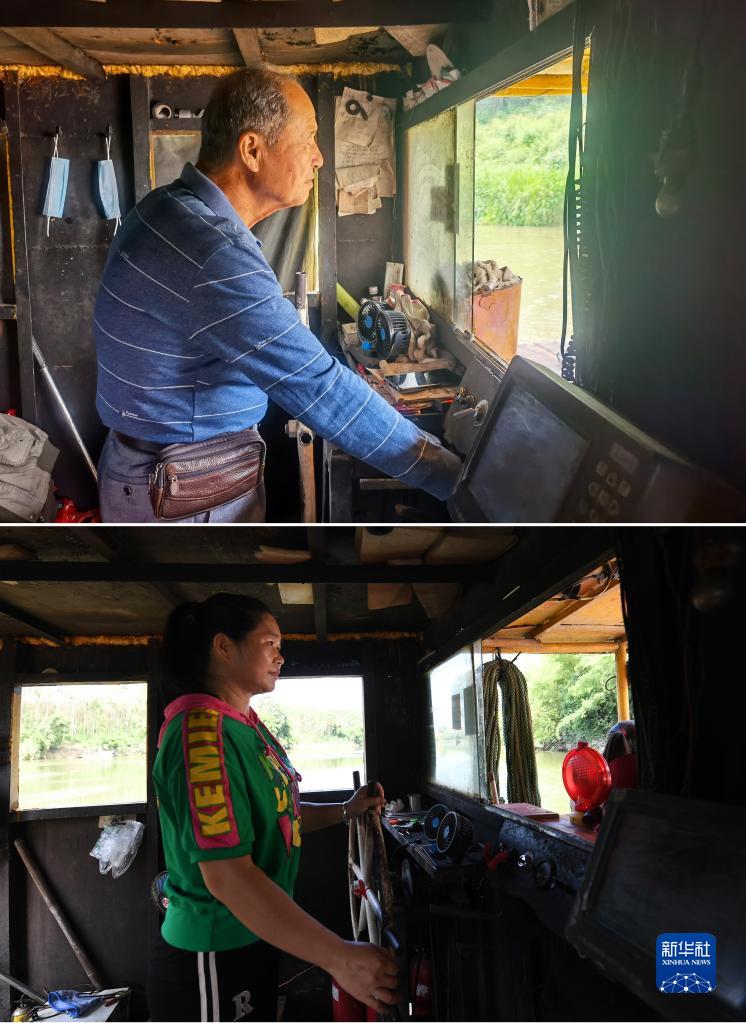 拼版照片:上圖為2022年5月11日拍攝的在廣西來(lái)賓市興賓區遷江鎮大力村清水河上,李曼榮的公公巫云飛生前在駕駛渡船(陸益丹攝);下圖為在廣西來(lái)賓市興賓區遷江鎮大力村清水河上,李曼榮在駕駛渡船(新華社記者陸波岸2023年7月4日攝)。