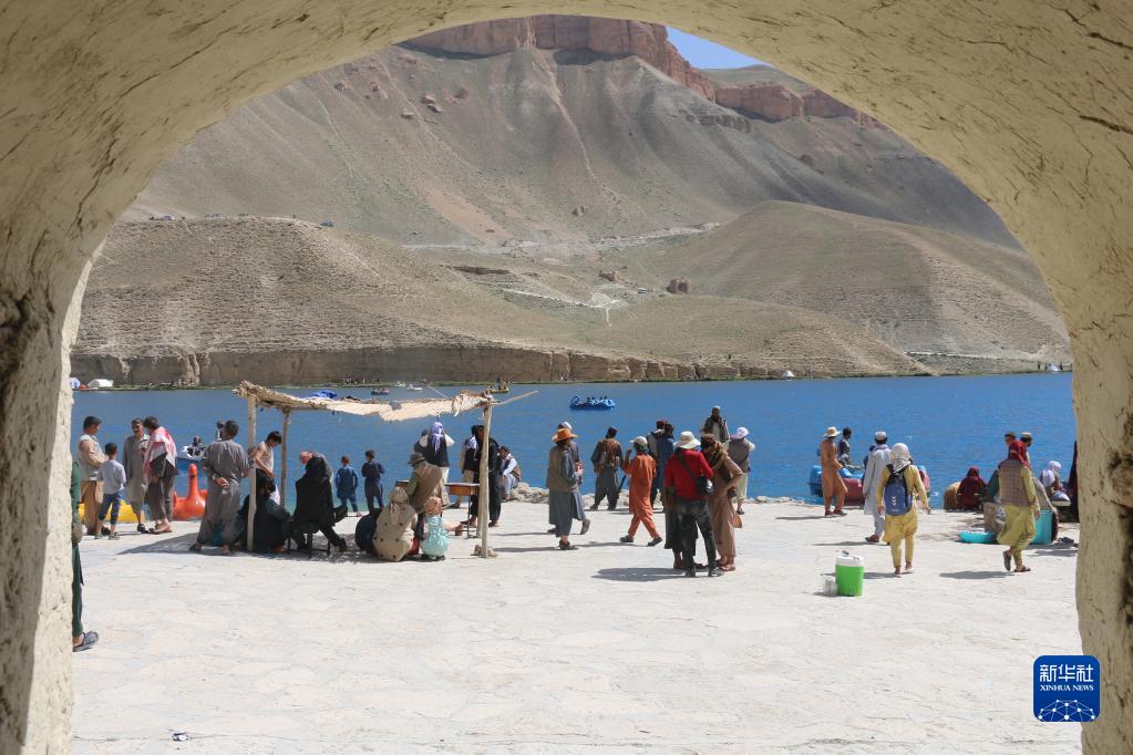 7月3日,游客在阿富汗巴米揚省班達米爾國家公園內的班達米爾湖邊游玩。
