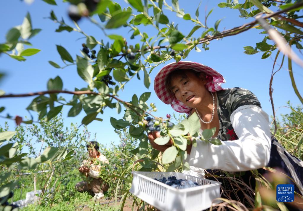 7月4日,河北省灤州市東安各莊鎮三山院村的農民在田間采摘藍莓。