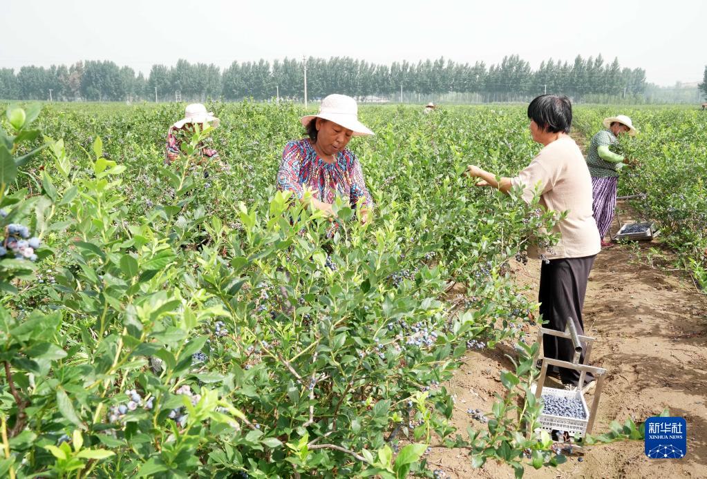 7月5日,河北省灤州市東安各莊鎮三山院村的農民在田間采摘藍莓。