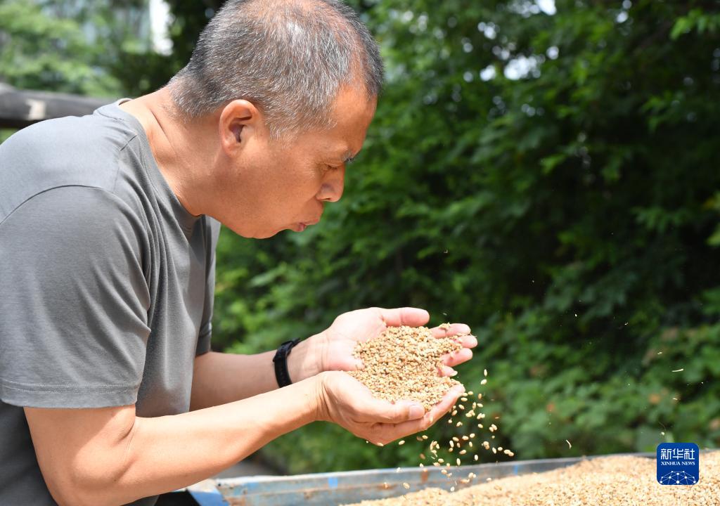 7月5日,河南唐河國家糧食儲備庫的工作人員在對小麥進(jìn)行初步檢查。