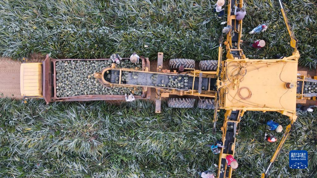 7月5日,在印度尼西亞楠榜省德邦易勿剎縣一處菠蘿種植園,人們將采摘下來(lái)的菠蘿裝車(chē)(無(wú)人機照片)。