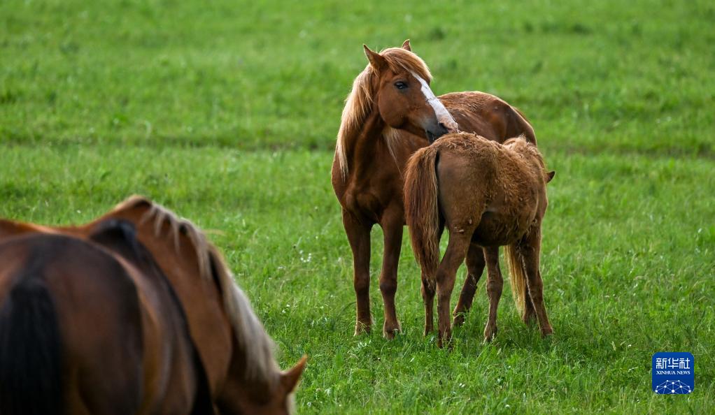 7月5日,馬群在草原上悠閑覓食、漫步。