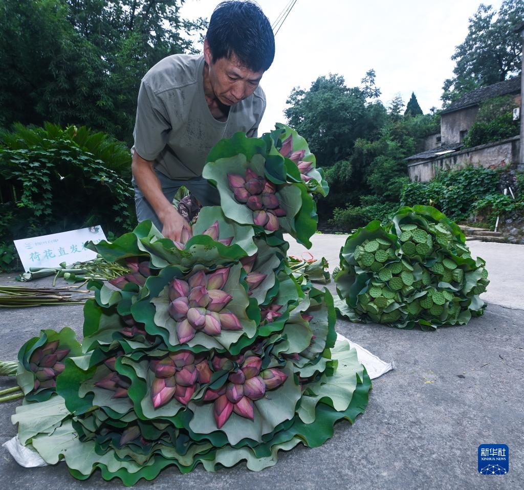 7月6日清晨,浙江省建德市大慈巖鎮里葉村村民在分類(lèi)打包剛采摘的荷花和蓮蓬。這些荷花和蓮蓬分類(lèi)包裝后,將快速運往江浙滬的花卉市場(chǎng)。