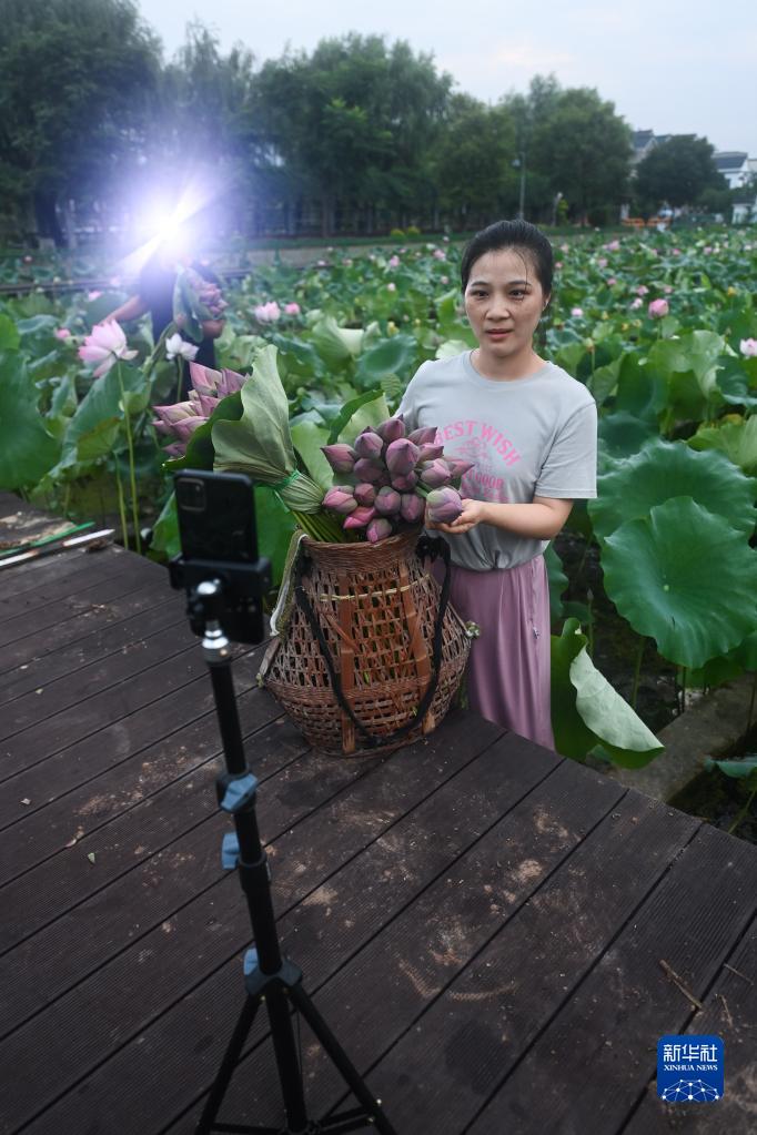 7月6日清晨,浙江省建德市大慈巖鎮里葉村村民在荷塘里錄制視頻,介紹荷花的品種和采摘過(guò)程。