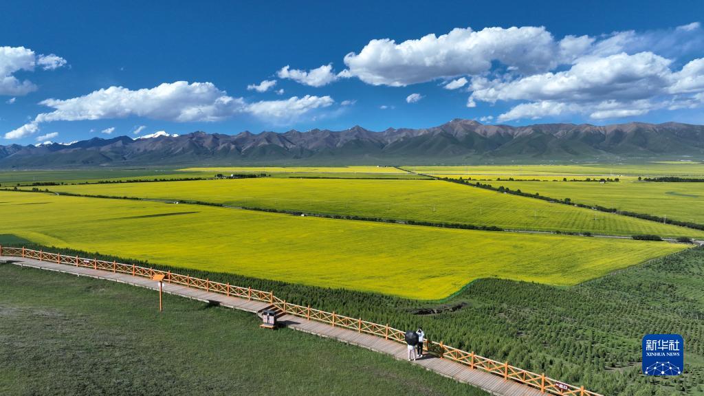 夏日,在位于祁連山腹地的青海省海北藏族自治州門(mén)源回族自治縣境內,油菜花競相綻放,花海、雪山、草原共同組成色彩斑斕的祁連山夏日畫(huà)卷。