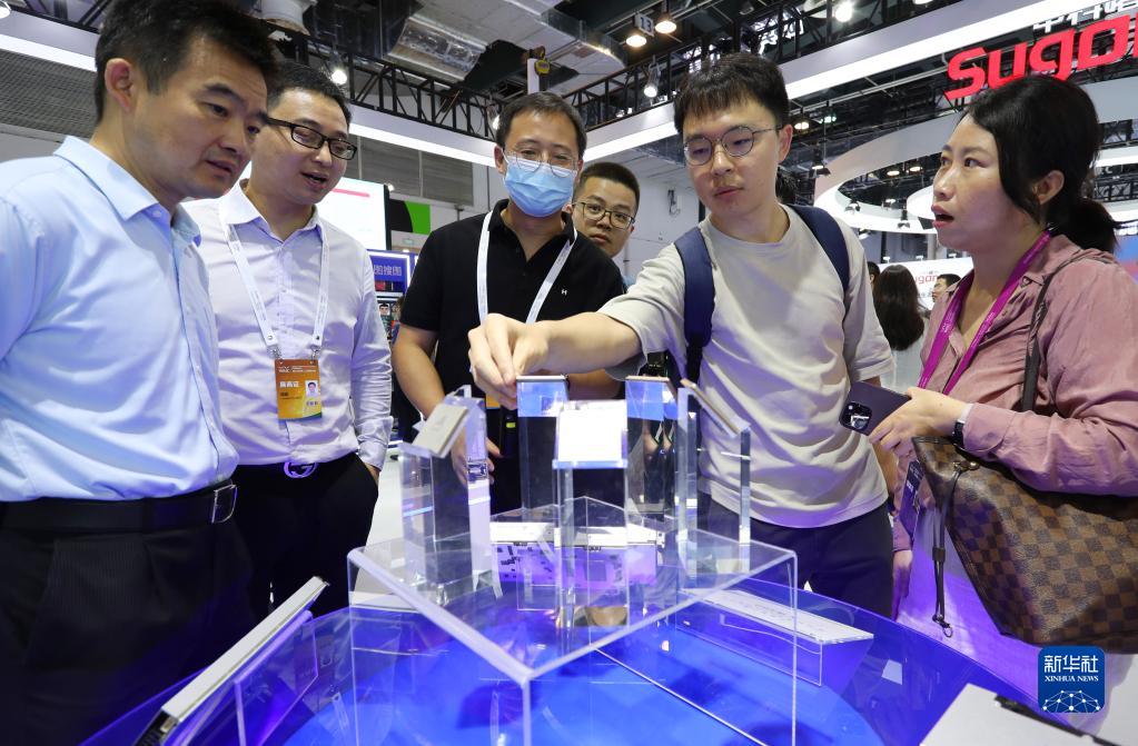 7月6日,參觀(guān)者在2023世界人工智能大會(huì )展會(huì )現場(chǎng)的通用GPU芯片展品前交流。