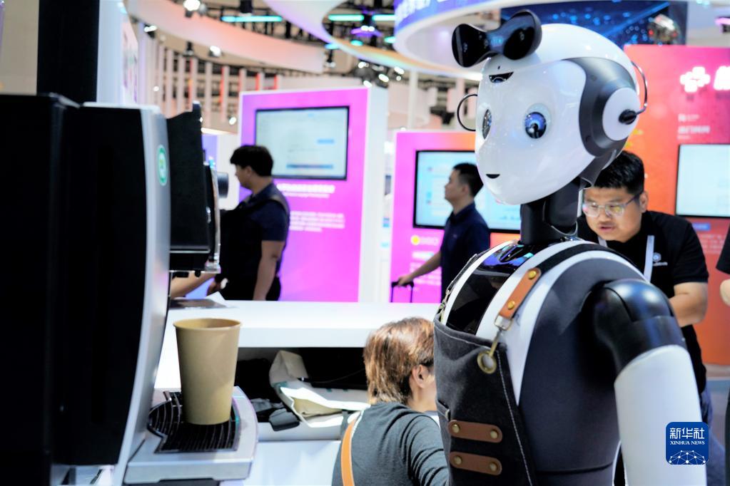 7月6日,達闥智能服務(wù)機器人在展會(huì )現場(chǎng)制作咖啡。