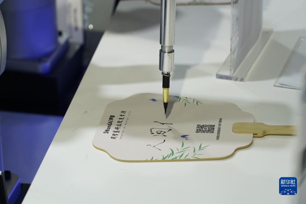 7月6日,SoundAI聲智機械手臂在2023世界人工智能大會(huì )展會(huì )現場(chǎng)進(jìn)行團扇書(shū)法寫(xiě)作。