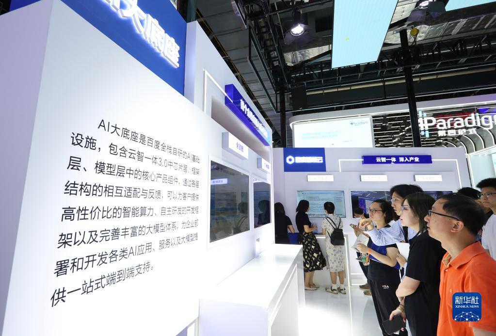 7月6日,參觀(guān)者在2023世界人工智能大會(huì )展會(huì )現場(chǎng)的百度“AI大底座”內容介紹展臺前駐足觀(guān)看。