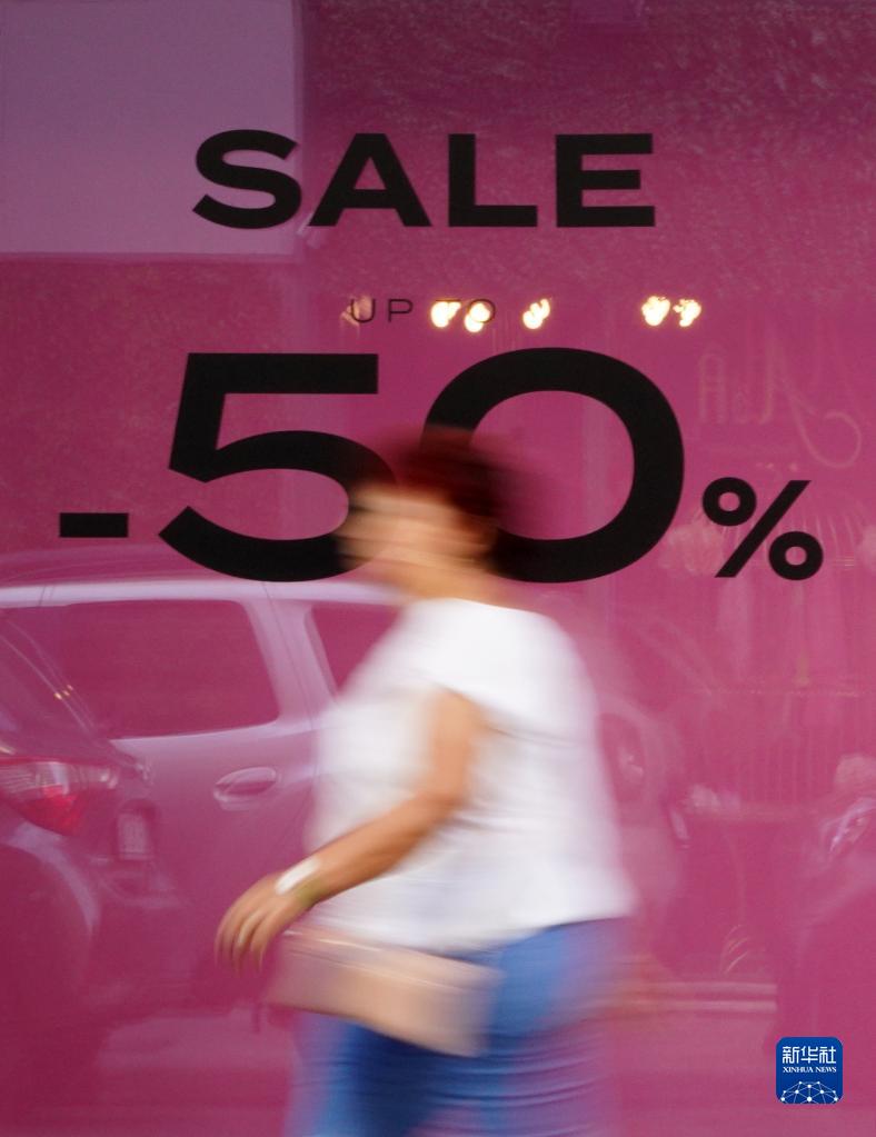 7月6日,行人經(jīng)過(guò)意大利羅馬一處商場(chǎng)的夏季打折廣告牌。