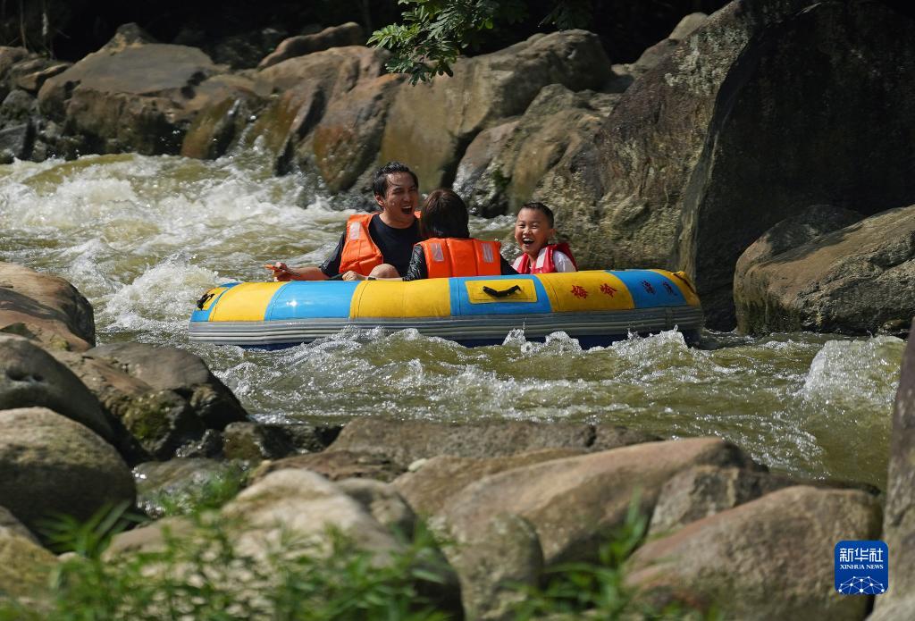 江西南昌連日高溫,人們來(lái)到郊外峽谷山澗,體驗漂流旅游項目,親近自然山水,享受夏日清涼。