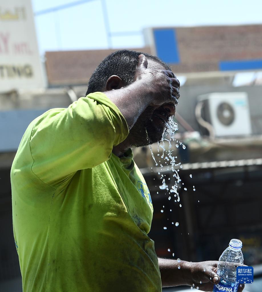 7月6日,一名男子在科威特首都省為自己潑水降溫。
