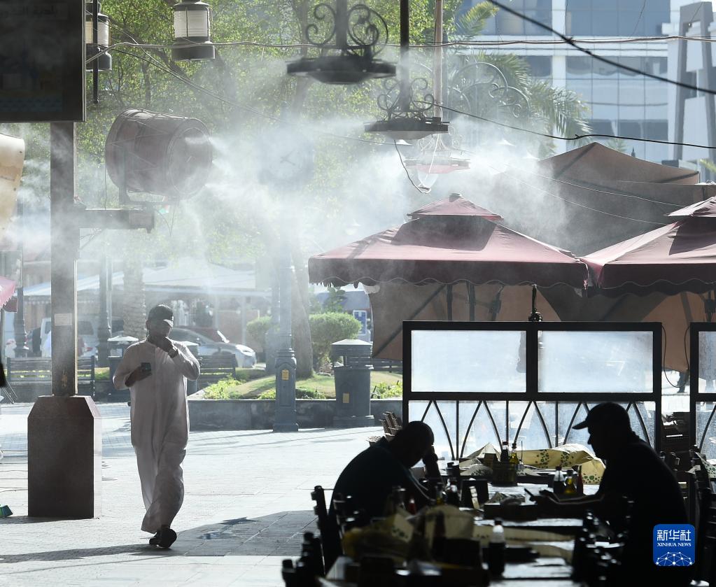 7月6日,人們走過(guò)科威特首都省一家市場(chǎng)的自動(dòng)噴霧降溫裝置。