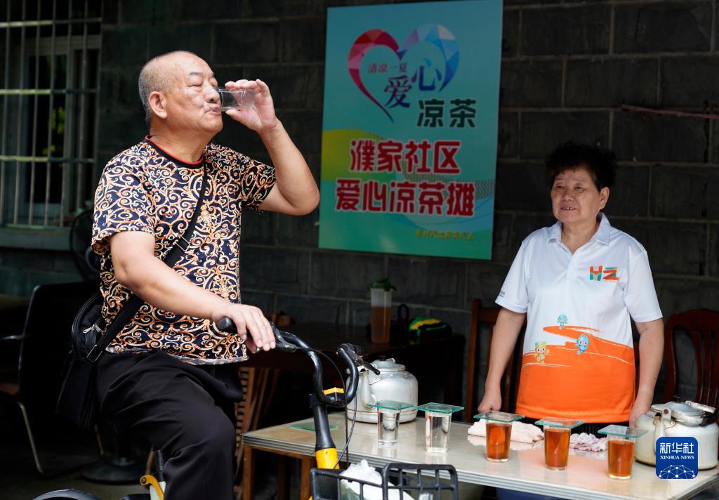 7月7日,社區居民(左)在杭州市濮家聯(lián)合社區愛(ài)心涼茶攤喝涼茶。