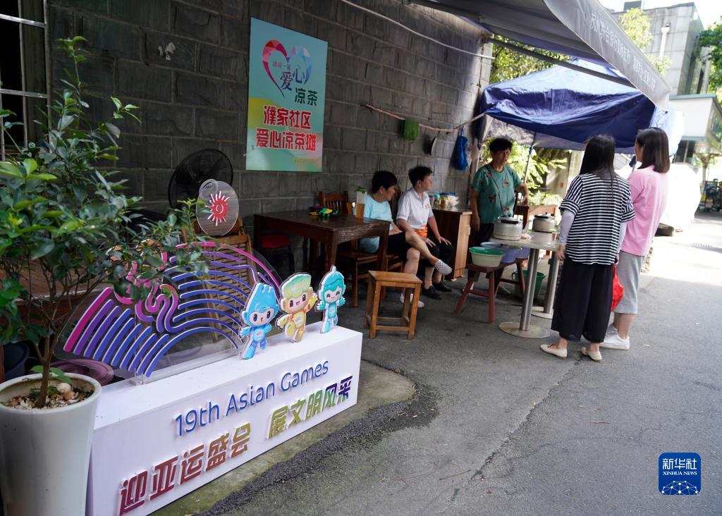 這是7月7日拍攝的杭州市濮家聯(lián)合社區愛(ài)心涼茶攤和一旁的迎亞運景觀(guān)小品。