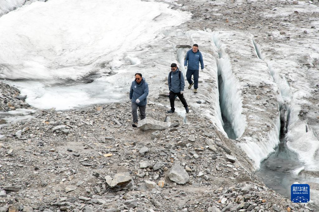 玉龍雪山站站長(cháng)王世金(左)和團隊成員馬興剛(中)、燕興國攜帶監測設備在玉龍雪山白水河1號冰川上行進(jìn)(6月19日攝)。