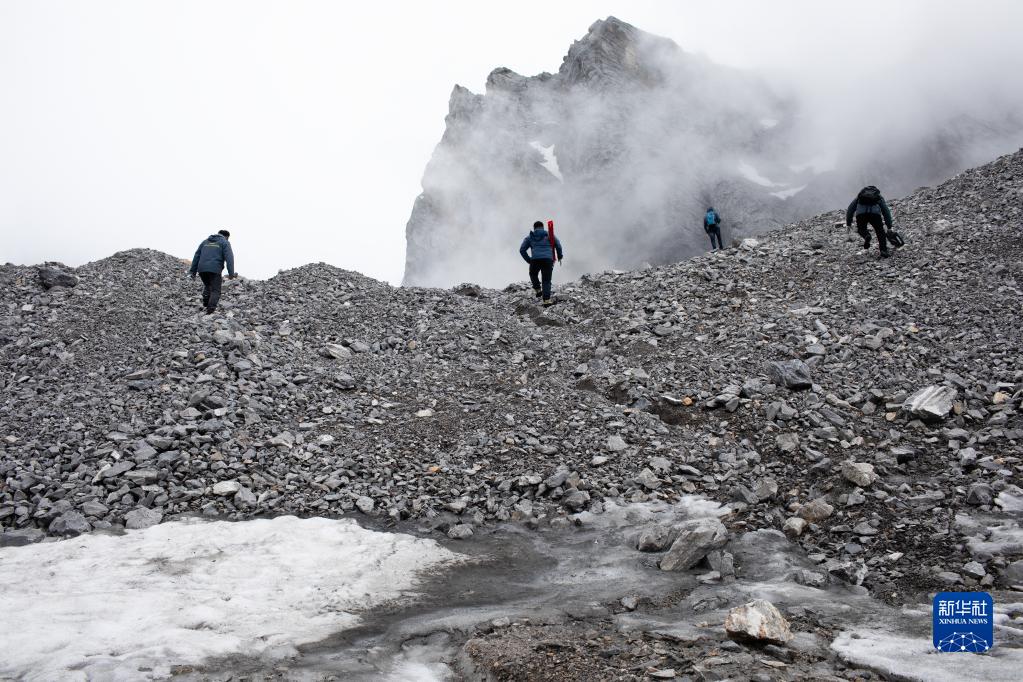 玉龍雪山站站長(cháng)王世金(左一)和團隊成員攜帶監測設備前往玉龍雪山白水河1號冰川(6月19日攝)。