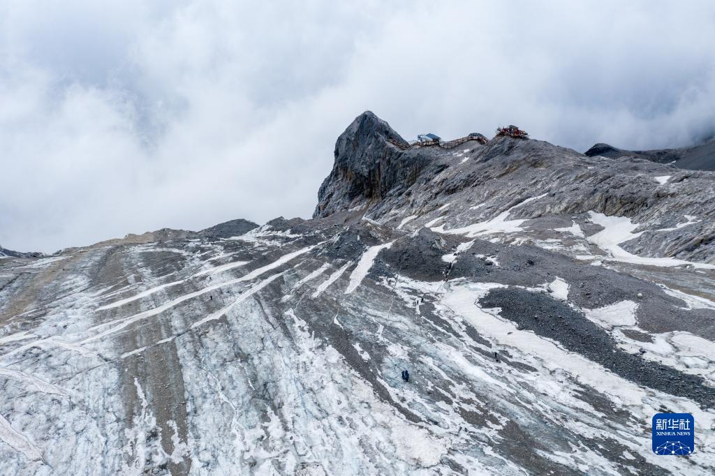 玉龍雪山站工作人員在白水河1號冰川上工作,遠處是游客棧道(6月16日攝,無(wú)人機照片)。