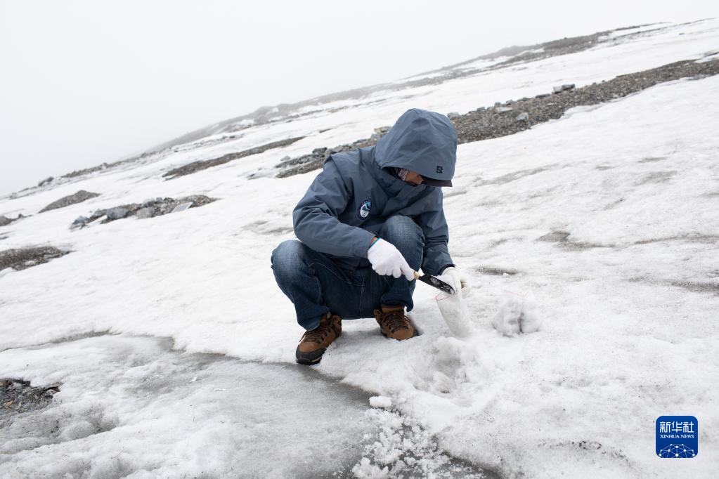 玉龍雪山站工作人員杜春紅在白水河1號冰川上采集雪樣(6月19日攝)。