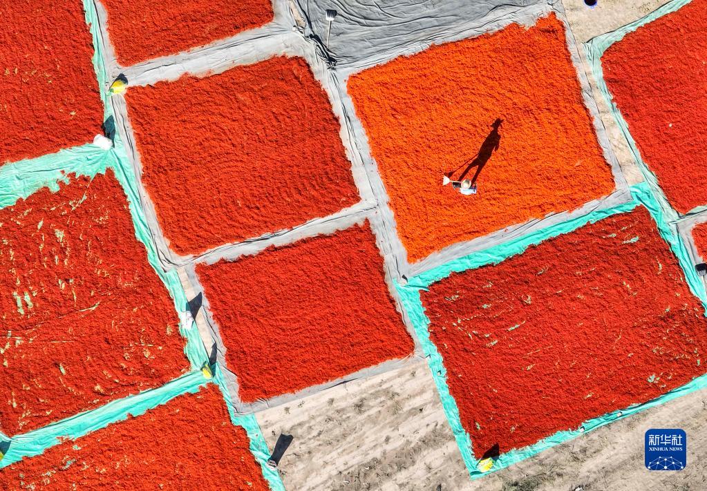 7月7日,新疆裕民縣江格斯鄉的村民在晾曬紅花絲(無(wú)人機照片)。