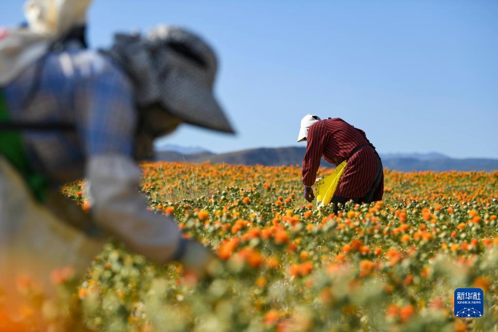 7月7日,采摘工人在新疆裕民縣江格斯鄉江格斯南村采收紅花絲。