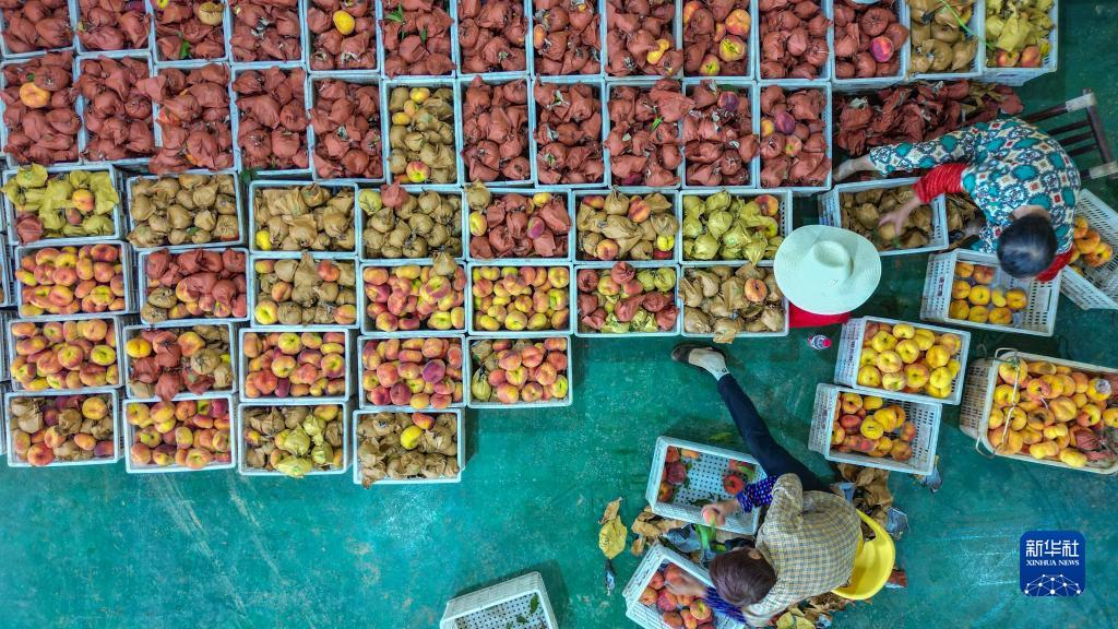 7月7日,在臨湘市聶市鎮乘嶺社區的涓湖果園,果農在分揀蟠桃(無(wú)人機照片)。